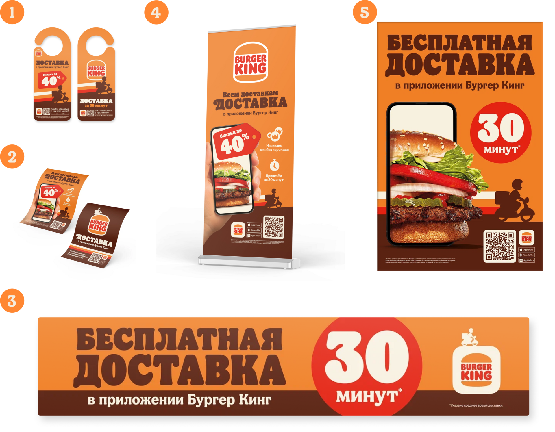 Цель этих материалов — продвигать сервис Доставки в мобильном приложении Бургер Кинг. Материалы размещаются как внутри ресторанов, так и за его пределами: